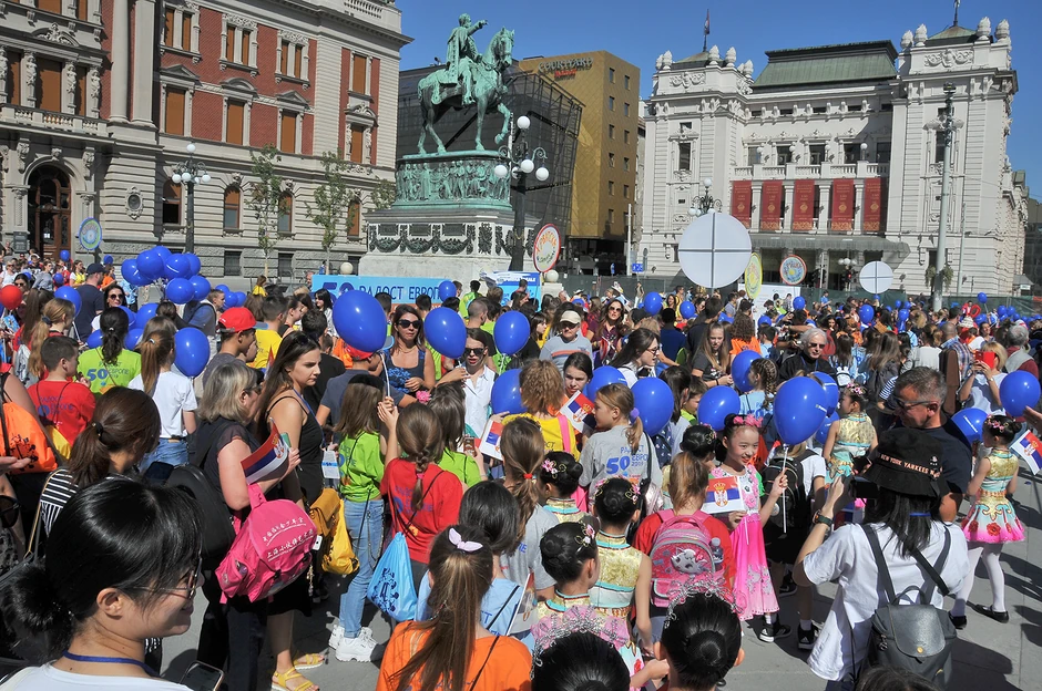 Karnevalom u centru Beograda danas je počela jubilarna 50. Međunarodna manifestacija dece Evrope "Radost Evrope". Oko hiljadu mališana, obučeno u svoje tradicionalne nošnje, učestvovalo je u muzičko-scenskom programu i kreativnim radionicama generalnog pokrovitelja manifestacije "Forma Ideale" i kompanije "NIS" na Trgu republike, svečanom defileu u Knez Mihailovoj ulici i ceremoniji otvaranja na Kalemegdanu.