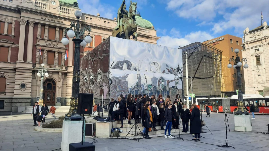 Reporter "Blica" na terenu je ispred ogledala zatekao hor, ali niko nije znao da kaže otkud ova ogledala baš ovde, oko spomenika, simbola našeg grada.