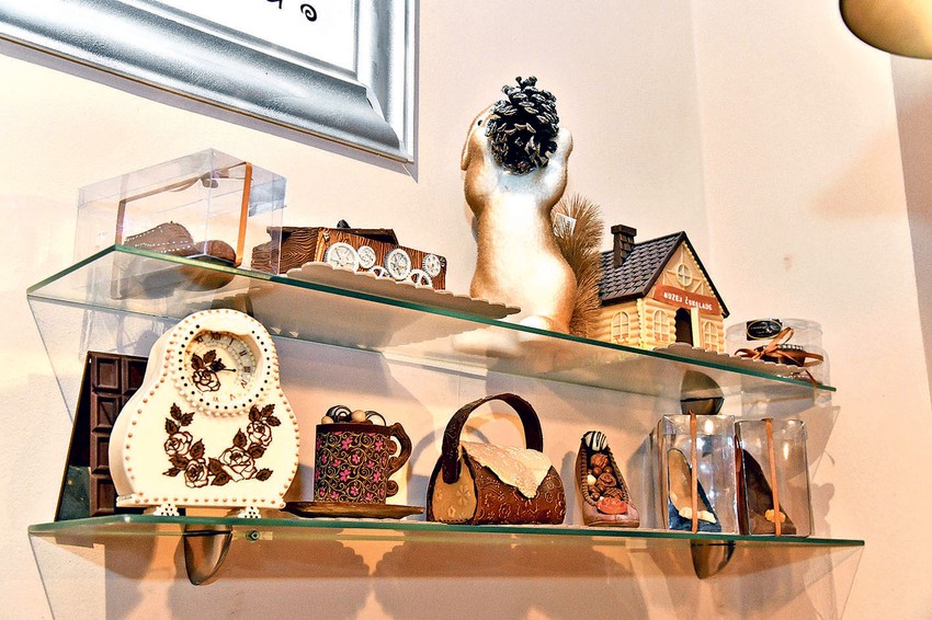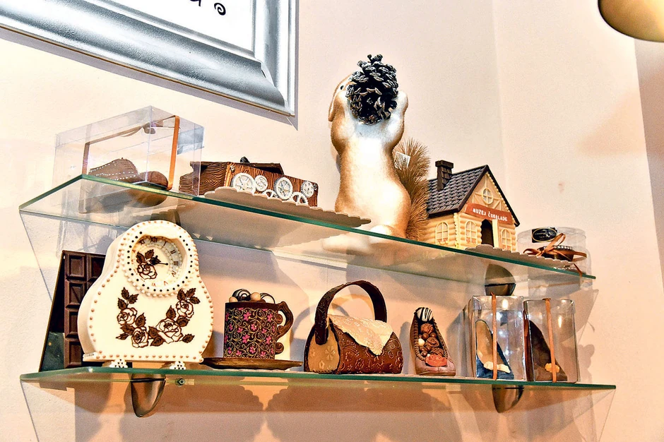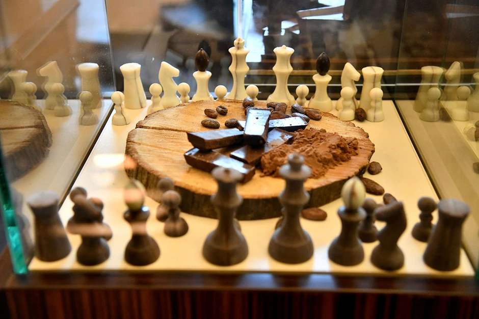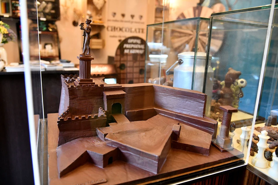 Ulazimo u prostoriju u kojoj su predmeti od čokolade - maketa Kalemegdana, šahovska tabla, fontana, kuća...