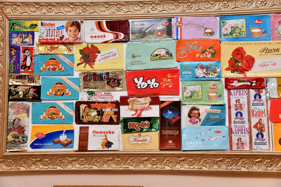 Čitav jedan zid je sa omotima čokolada, do kojih nije bilo lako doći, a koje nas vraćaju u detinjstvo i bude posebna sećanja. Ali tu su i drugi eksponati poput makete prve srpske fabrike čokolade.