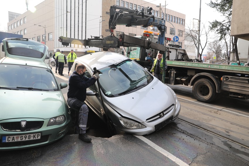 Do ogromne rupe u asfaltu koja je danas popode bukvalno progutala dva automobila u centru Beograda došlo je zbog pucanja cevi.