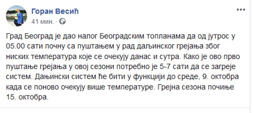 On je podsetio da je, s obzirom da je ovo prvo puštanje grejanja u sezoni, potrebno pet do sedam sati da se zagreje sistem i dodao da će danjinski sistem grejanja biti u funkciji do srede, 9. oktobra, kada se ponovo očekuju više temperature.