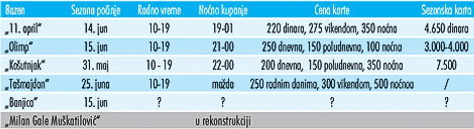 Za oko petnaestak dana većina beogradskih bazena počinje sa radom. Cena dnevne karate u proseku je 250 dinara, radno vreme je od 10 do 19 sati, a u ponudi će biti i noćno kupanje. Sreda je dan kad će, kao i prethodnih godina, osnovci uz đačku knjižicu besplatno moći da koriste sve bazene u gradu. Letnja sezona na Adi Ciganliji još nije počela i zvanično će biti otvorena kad temperatura vode bude bila 22 stepena Celzijusa.
