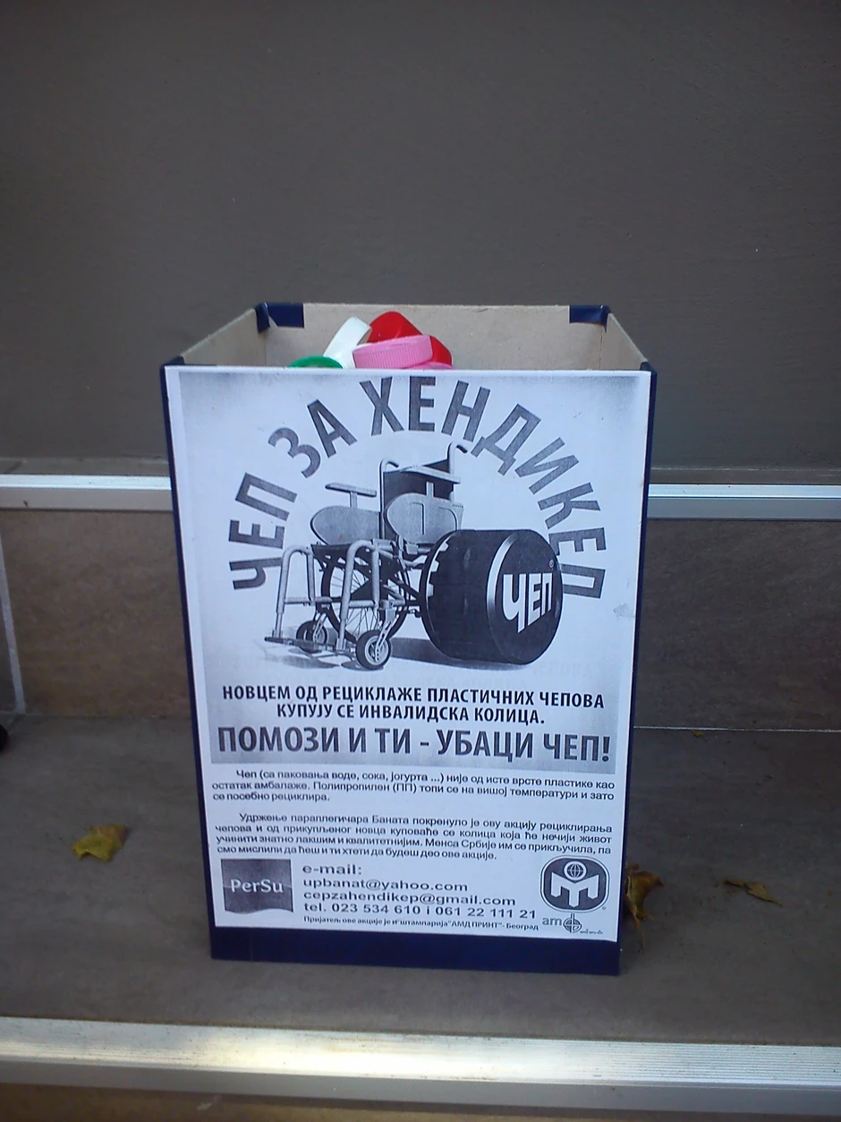 Udruženje paraplegičara I kvadriplegičara Banata iz Zrenjanina, pokrenulo je ovu akciju još pre tri godine. Zahvaljujući čepovima od flaša koje ostavljaju humani građani, do danas je prikupljeno dovoljno novca za 17 invalidskih kolica, 8 sobnih kolica i 4 hodalice, dok na pomoć čeka još 70 osoba.