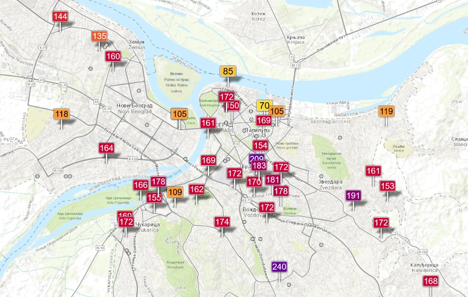 Najkritičnije je u Čačku, Užicu, Kraljevu, Novom Pazaru, Leskovcu, Nišu. Ni Beograd ne zaostaje na ovoj neslavnoj listi, pa je tako veći deo opština u prestonici u crvenoj, odnosno ljubičastoj zoni.
