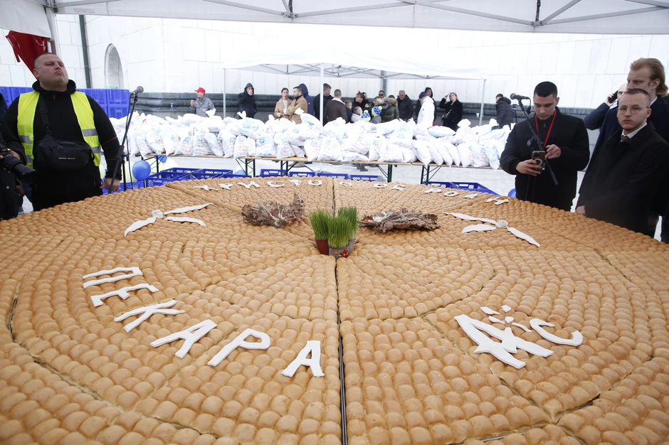 Članovi Esnafa pekara Srbije i pekara AS-Braća Stanković pripremili su česnicu sa više od 200 kilograma testa prečnika 4 metra u kojoj će biti 33 zlatna dukata, saopšteno je iz ovog esnafa.