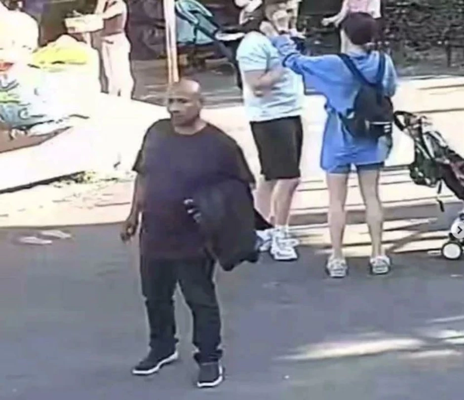 Lopov je imao crnu majicu, nosio je crnu jaknu preko desne ruke i imao je nešto izraženiji stomak.