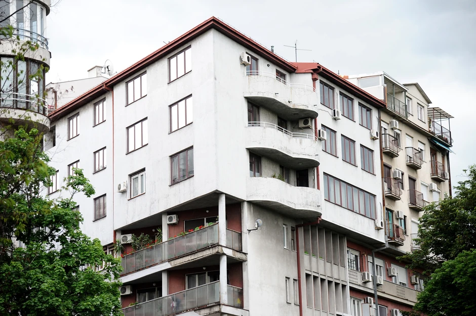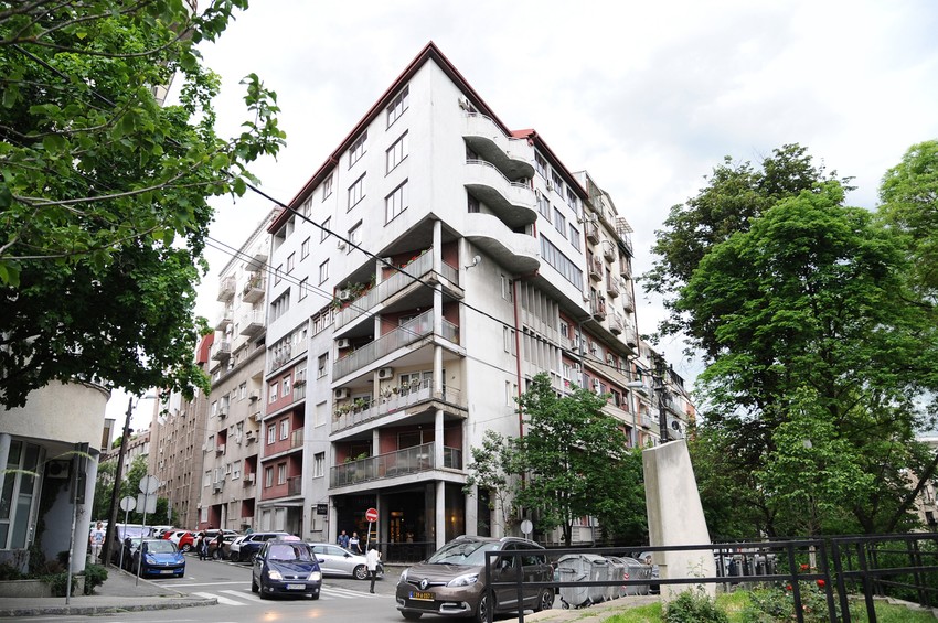 Na svega nekoliko metara od Karađorđevog parka, na uglu Internacionalnih brigada i Nebojšine ulice, nalazi se zgrada koja izgleda kao da je na nju neko "nasadio" još jednu trospratnicu. A uz to se i potpuno razlikuju. Gornji deo zgrade je isturen u odnosu na donji deo i deluje kao da "visi". Fasada donjeg dela je crvena, a gore uglavnom siva i bela, a tu su i stubovi, koji se prostiru do tačno početka nove, dodate građevine.