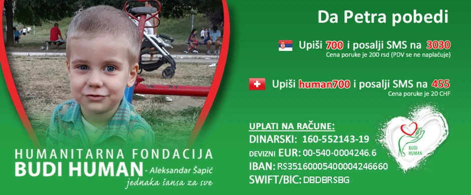 Petri je potrebna novčana pomoć kako bi lečenje nastavila u inostranstvu, da bi se izlečila njena primarna maligna bolest sa što manjim posledicama po njen dalji razvoj i odrastanje. Novac je neophodan za lečenje, rehabilitacije, specijalističke preglede, dalja ispitivanja...
