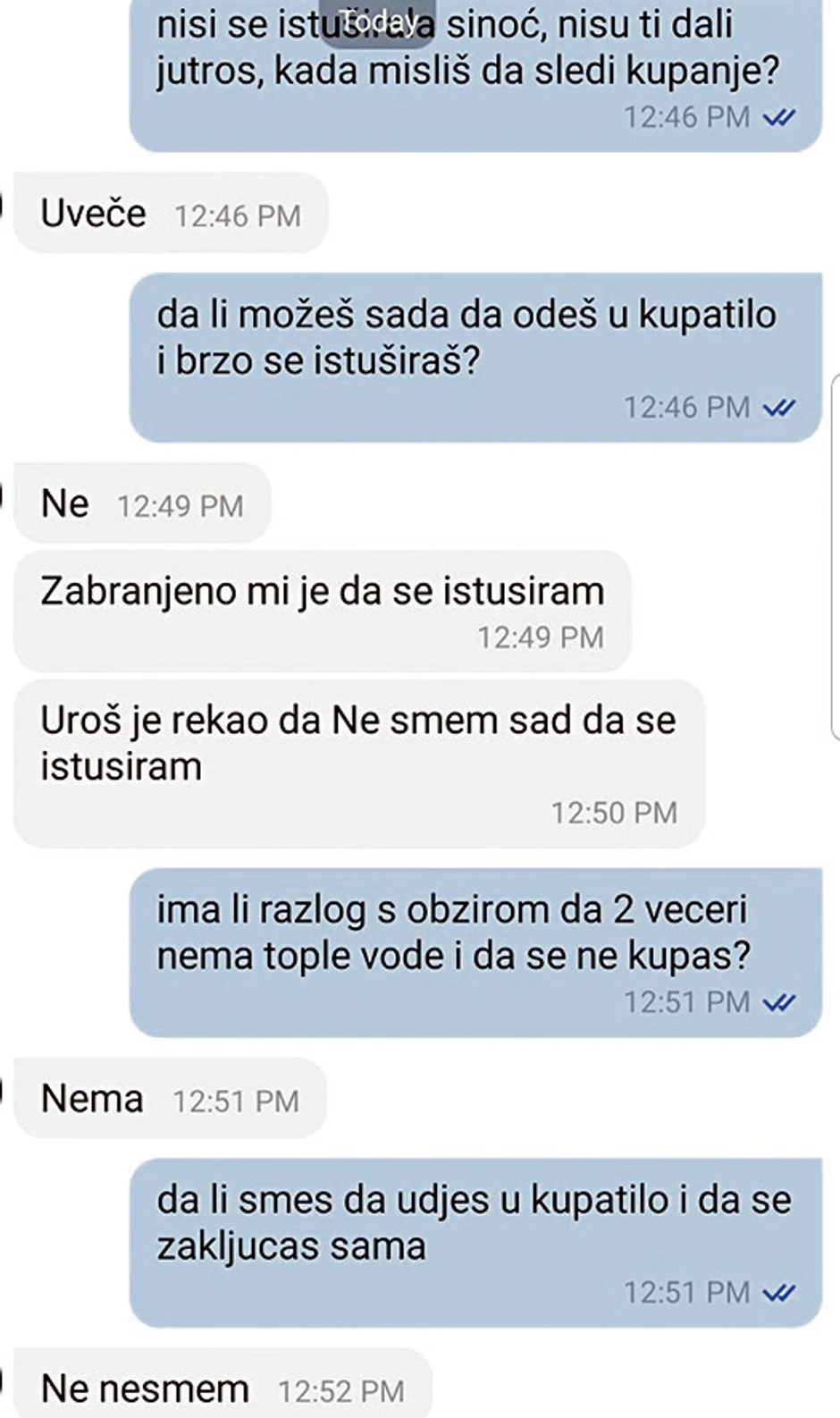 K. P. je imala čak zabranu i na kupanje, jer je vreme kada bi to činila, između ostalog koristila i da razgovara telefonom sa mamom.