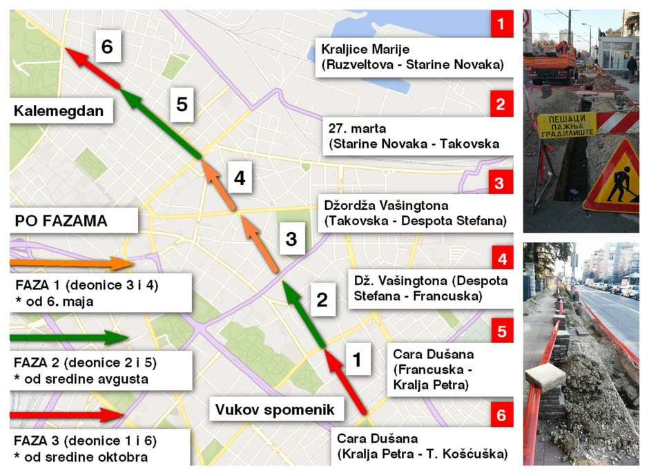 Beograđani, ovog proleća i leta moraćete da se naoružate strpljenjem kada budete prolazili kroz centar grada. Naime, osim radova na rekonstrukciji Trga republike, već od 6. maja nas očekuje novo zatvaranje saobraćajnica u centru prestonice i to od Vukovog spomenika pa do Kalemegdana. Po fazama.