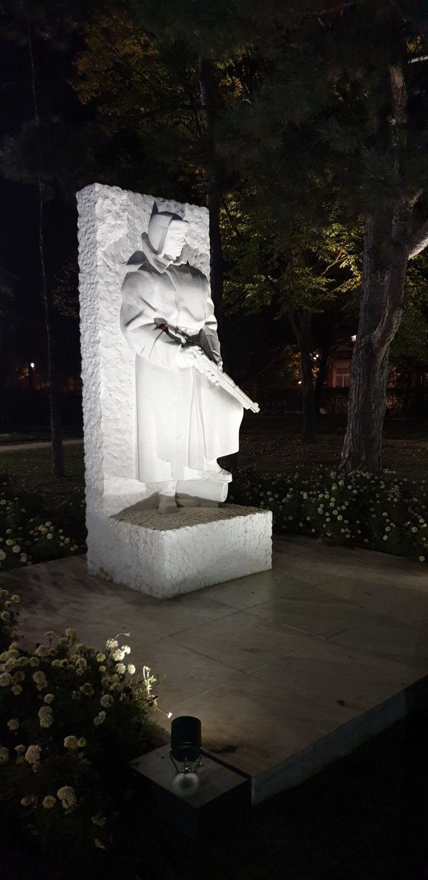 Figuru Crvenoarmejca, izvedenog od bračkog kamena, u kompleksu groblja, izradio je vajar Antun Augustinčić. Ova figura predstavlja repliku figure pešadijskog vojnika sa spomenika u Batini, nekadašnjom Batinoj skeli u danačnjoj Republici Hrvatskoj.