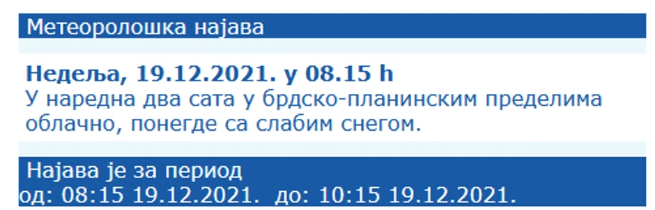 U Srbiji će danas biti pretežno oblačno i suvo, samo je u planinskim predelima na istoku moguće provejavanje slabog snega. Posle podne na zapadu i jugozapadu zemlje doći će do razvedravanja.
