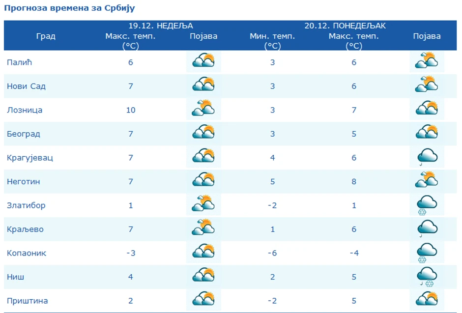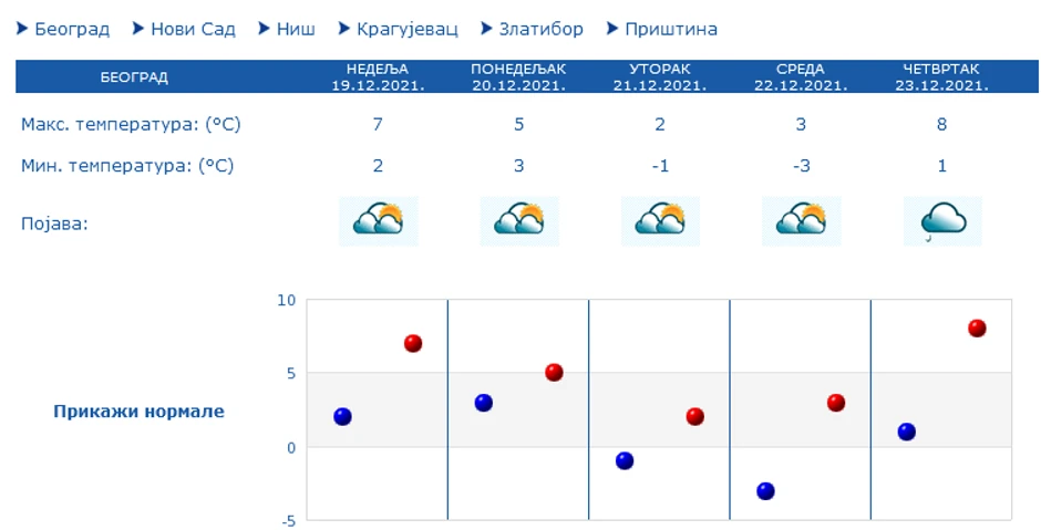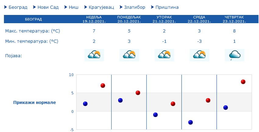 U Beogradu će biti pretežno oblačno i suvo, po podne kratkotrajno razvedravanje. Vetar slab i umeren zapadni. Najniža temperatura oko 2 C, najviša oko 7 C. U toku noći ka ponedeljku moguća je kratkotrajna slaba kiša.