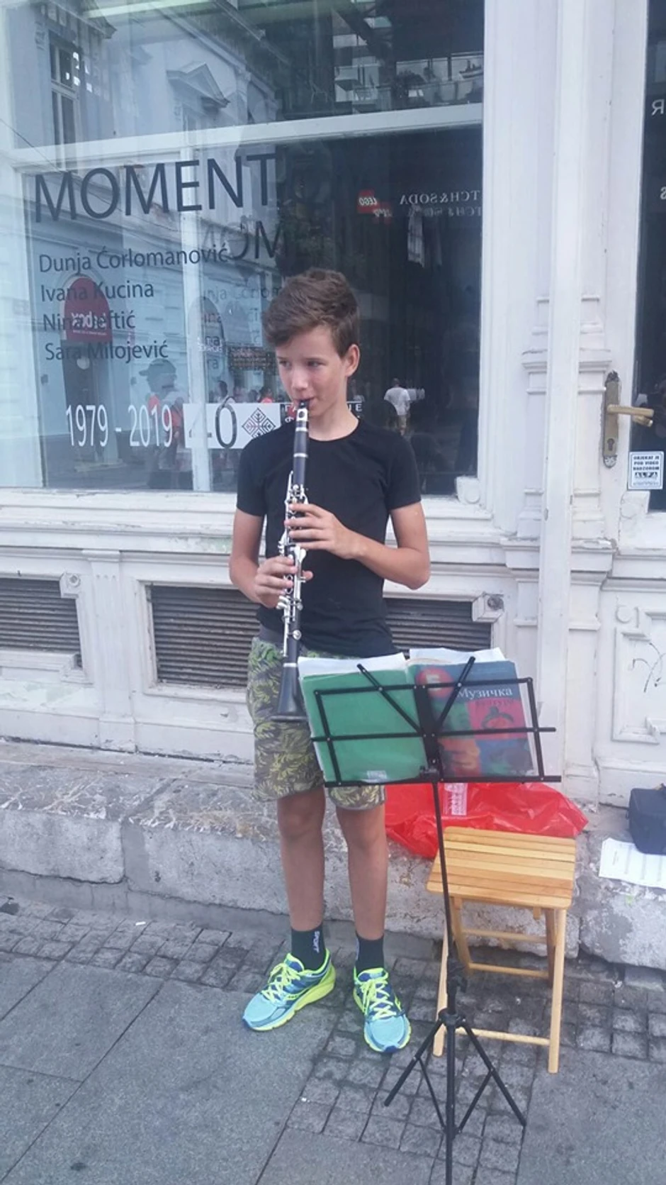 Filip Milinković je dečak koji ima samo 12 i po godina, a koji već pleni svojim sviranjem klarineta. Zatekli smo ga na kraju Knez Mihailove sa majkom Tanjom, gde se još spremao da počne sa svojim "nastupom".