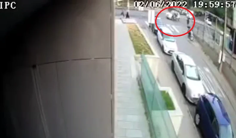 Motor se odbija od automobil i leti ka trotoaru, a kako se vidi na snimku, umalo da obori slučajnog prolaznika na trotoaru. Zaustavio se na nekoliko milimetri od pešaka.