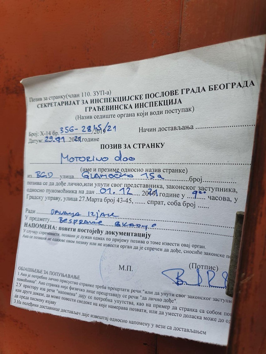 Pre dva dana saopšteno je iz Sekretarijata za inspekcijske poslove da je izlaskom na teren utvrđeno da investitor poseduje rešenje kojim se odobravaju radovi na rekonstrukciji objekta na placu, ali ne i potvrdu o prijavi radova. Predstavnik firme "Motorino" pozvan je da se javi u prostorije Gradske uprave kako bi dao izjavu po predmetu bespravna gradnja, pišu "Novosti".