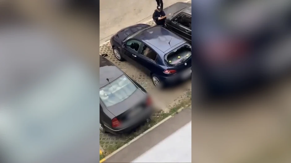 Muškarac na sebi ima crni kačket i crnu duksericu. Sve vreme uz psovke i galamu, on iz sve snage i bez prestanka udara prvo u staklo, a zatim i po celom automobilu!