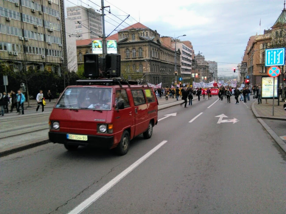Predvodnica kolone današnjeg protesta u Beogradu je crveni "micubiši" kombi iz 1991. godine!