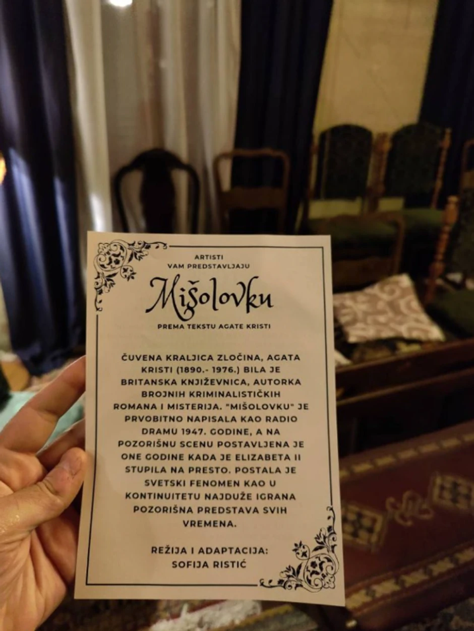 Sofija Ristić, rediteljka predstave Mišolovka, rađene po adaptaciji proslavljenog dela Agate Kristi dočekala je goste i rekla nam da će za nekoliko minuta početi izvođenje čuvenog komada, po 59. put u neobičnoj i intimnoj atmosferi.
