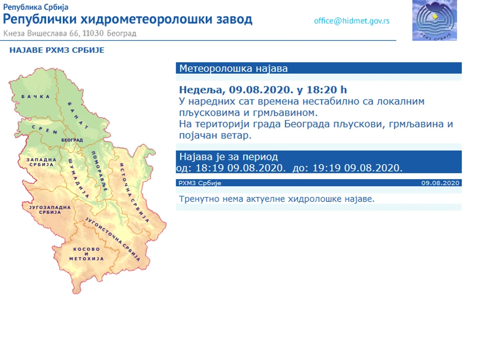 "U narednih sat vremena nestabilno sa lokalnim pljuskovima i grmljavinom. Na teritoriji grada Beograda pljuskovi, grmljavina i pojačan vetar", upozorio je RHMZ.