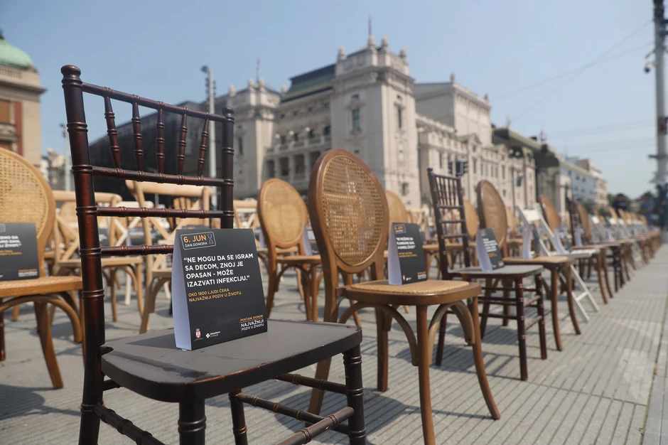 Instalacijom 1.800 stolica na Trgu republike u Beogradu na kojima simbolično sede pacijenti koji čekaju najvažniji poziv i na kojima su njihove lične poruke koje svedoče o težini života u neizvesnosti i nadi u bolje sutra obeležen je 6. jun, Nacionalni dan donora.