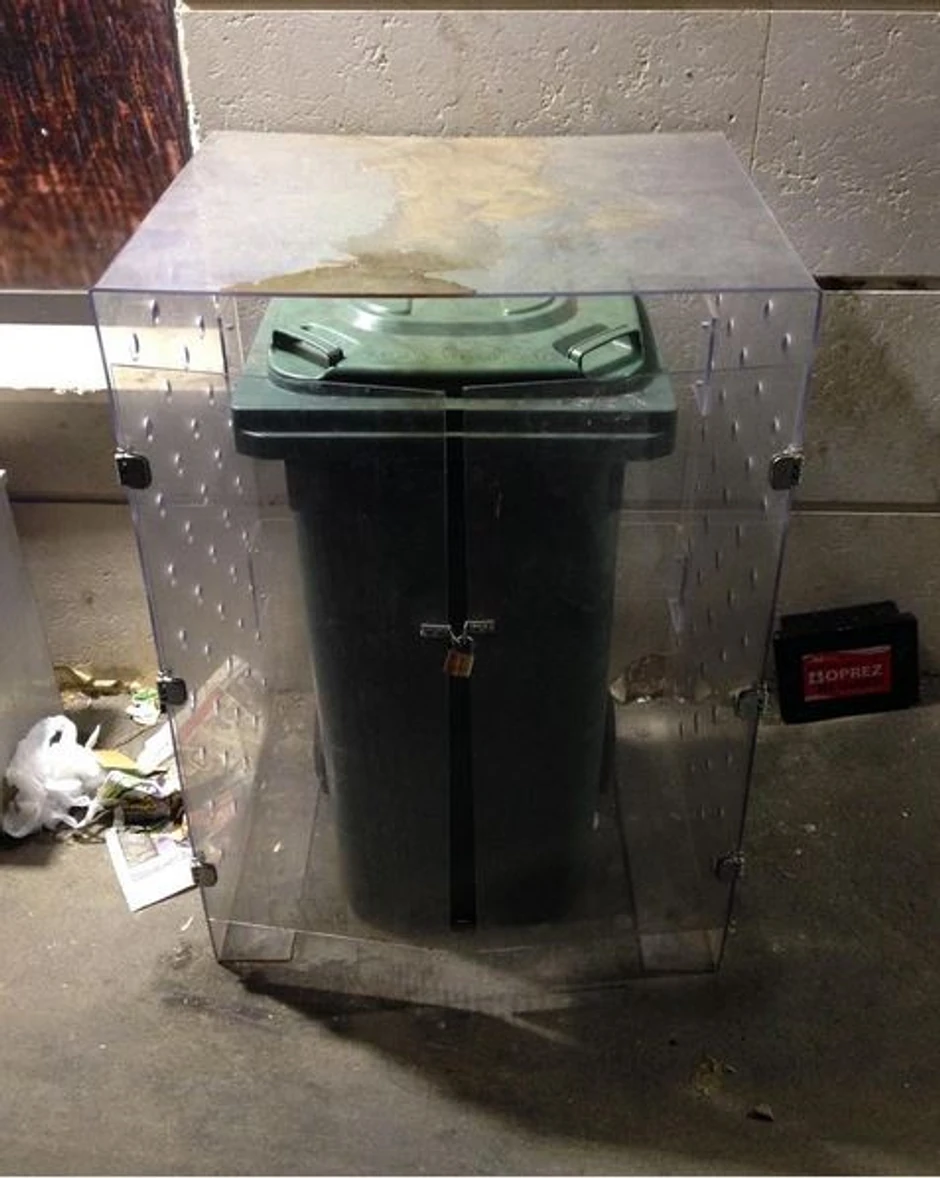 Gotovo komičan prizor već godinu dana krasi beogradsko naselje Crveni krst, gde pažnju prolaznika privlači zelena kanta za smeće, čuvana poput prave dragocenosti - u providnoj zaštitnoj konstrukciji, zaključana katancem!