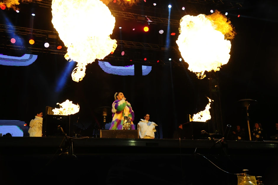 Lepa Brena je izašla na binu nešto pre 23.00. Pozdravljena je gromoglasnim aplauzom i, pošto je fanovima poželela u Novoj godini "što više zdravlja, posla i para", zapevala je "Boliš i ne prolaziš".