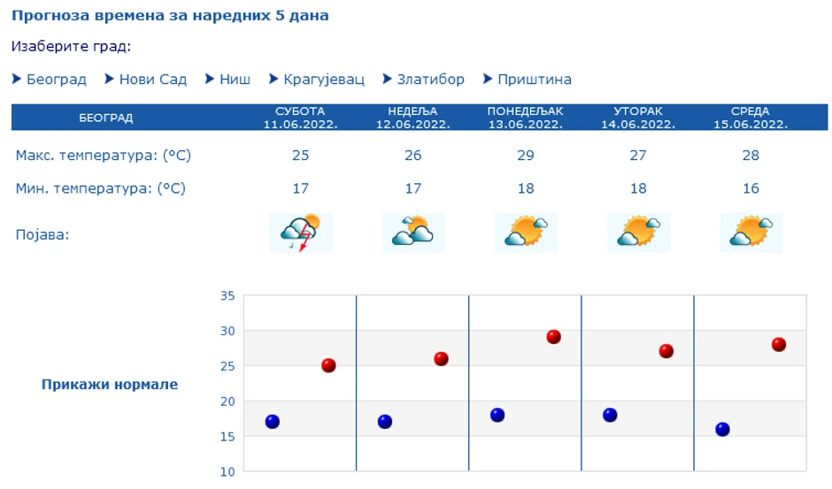 Republički hidrometeorološki zavod upozorio je danas na jake pljuskove i grmljavinu u toku dana, koji će lokalno biti praćeni gradom, jakim vetrom i većom količinom padavina za kratko vreme.