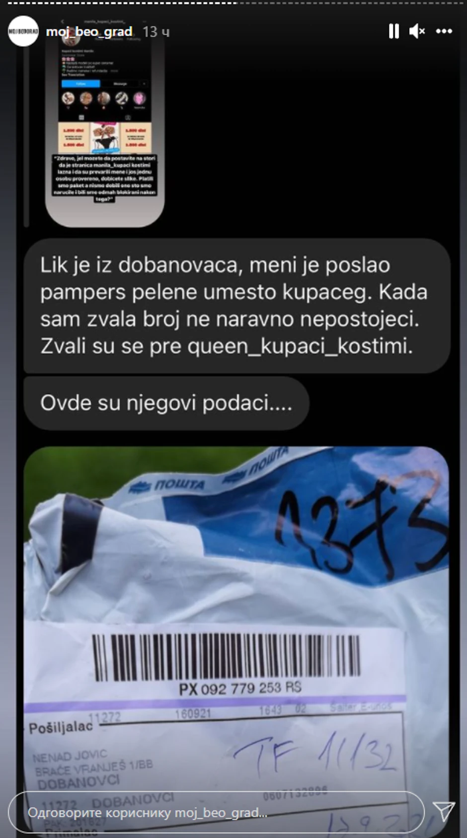 Sve je više onih koji javno govore o načinima na koje su prevareni i sopstvenim iskustvima. Tako je jedna Beograđanka preko Instagrama naručila kupaći kostim, a na adresu su joj stigle "pampers" pelene.