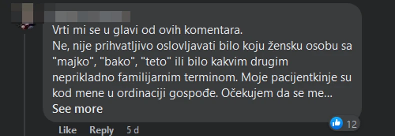 - Vrti mi se u glavi od ovih komentara. Ne, nije prihvatljivo oslovljavati bilo koju žensku osobu sa "majko", "bako", "teto" ili bilo kakvim drugim neprikladno familijarnim terminom. Moje pacijentkinje su kod mene u ordinaciji gospođe. Očekujem da se meni obraćaju sa istim poštovanjem.