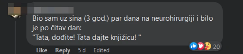 - Bio sam uz sina (3 godine) par dana na neurohirurgiji i bilo je po čitav dan: "Tata, dođite! Tata dajte knjižicu!" - napisao je jedan muškarac i dodao da mu je zapravo bilo simpatično što je u tim trenucima bio "njegovo veličanstvo tata".