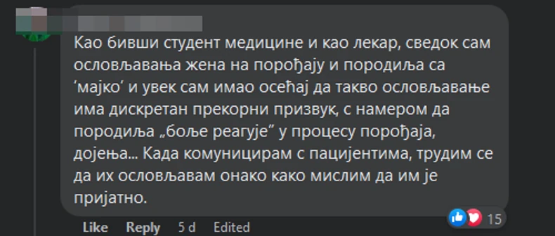 - Kao bivši student medicine i kao lekar, svedok sam oslovljavanja žena na porođaju i porodilja sa "majko" i uvek sam imao osećaj da takvo oslovljavanje ima diskretan prekorni prizvuk, s namerom da porodilja „bolje reaguje” u procesu porođaja, dojenja... Kada komuniciram s pacijentima, trudim se da ih oslovljavam onako kako mislim da im je prijatno.