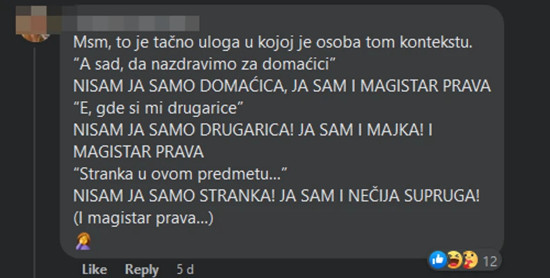 - Mislim, to je tačno uloga u kojoj je osoba tom kontekstu. “A sad, da nazdravimo za domaćicu”. NISAM JA SAMO DOMAĆICA, JA SAM I MAGISTAR PRAVA. “E, gde si mi drugarice”. NISAM JA SAMO DRUGARICA! JA SAM I MAJKA! I MAGISTAR PRAVA “Stranka u ovom predmetu…” NISAM JA SAMO STRANKA! JA SAM I NEČIJA SUPRUGA! (I magistar prava…) - ironično je objasnila još jedna korisnica društvenih mreža.