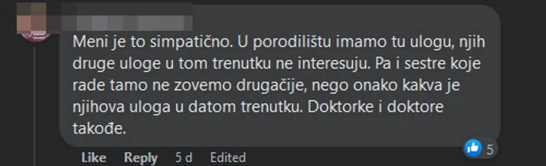 - Meni je to simpatično. U porodilištu imamo tu ulogu, njih druge uloge u tom trenutku ne interesuju. Pa i sestre koje rade tamo ne zovemo drugačije, nego onako kakva je njihova uloga u datom trenutku. Doktorke i doktore takođe - dodaju drugi.