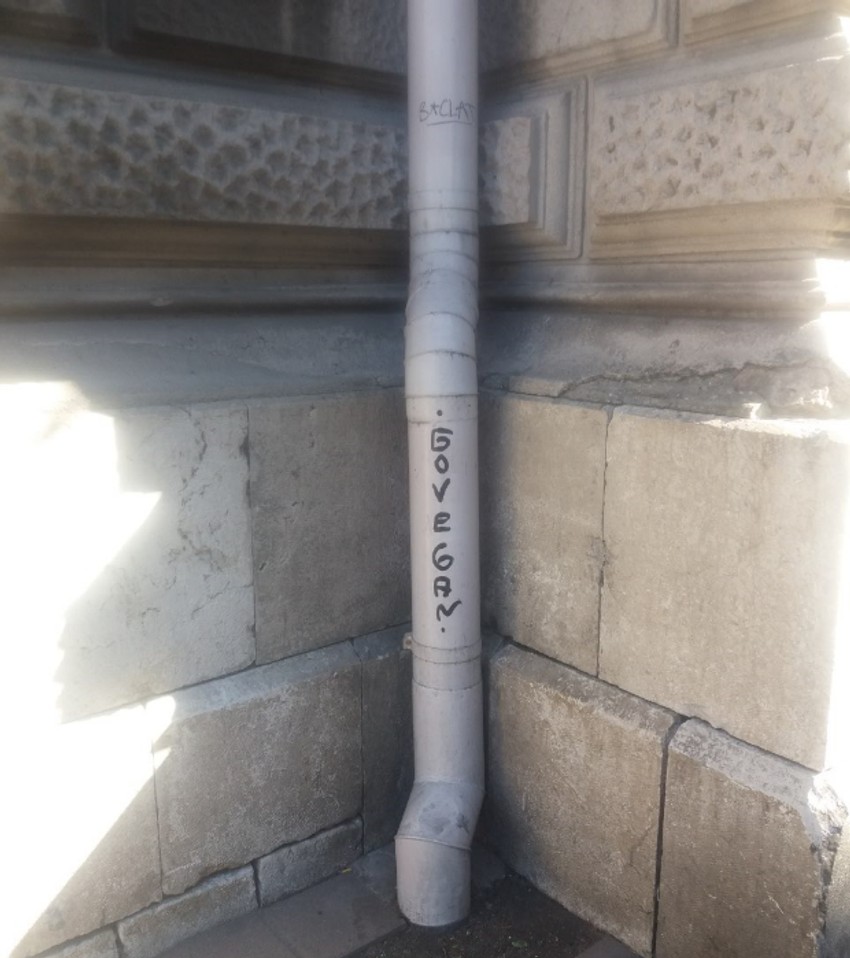Tako se primer nekulture i nepoštovanja onoga što je naše može videti na delu njene fasade koji se proteže Ulicom Dragoslava Jovanovića, a koji odskora krase crveni, narandžasti i crni natpisi.