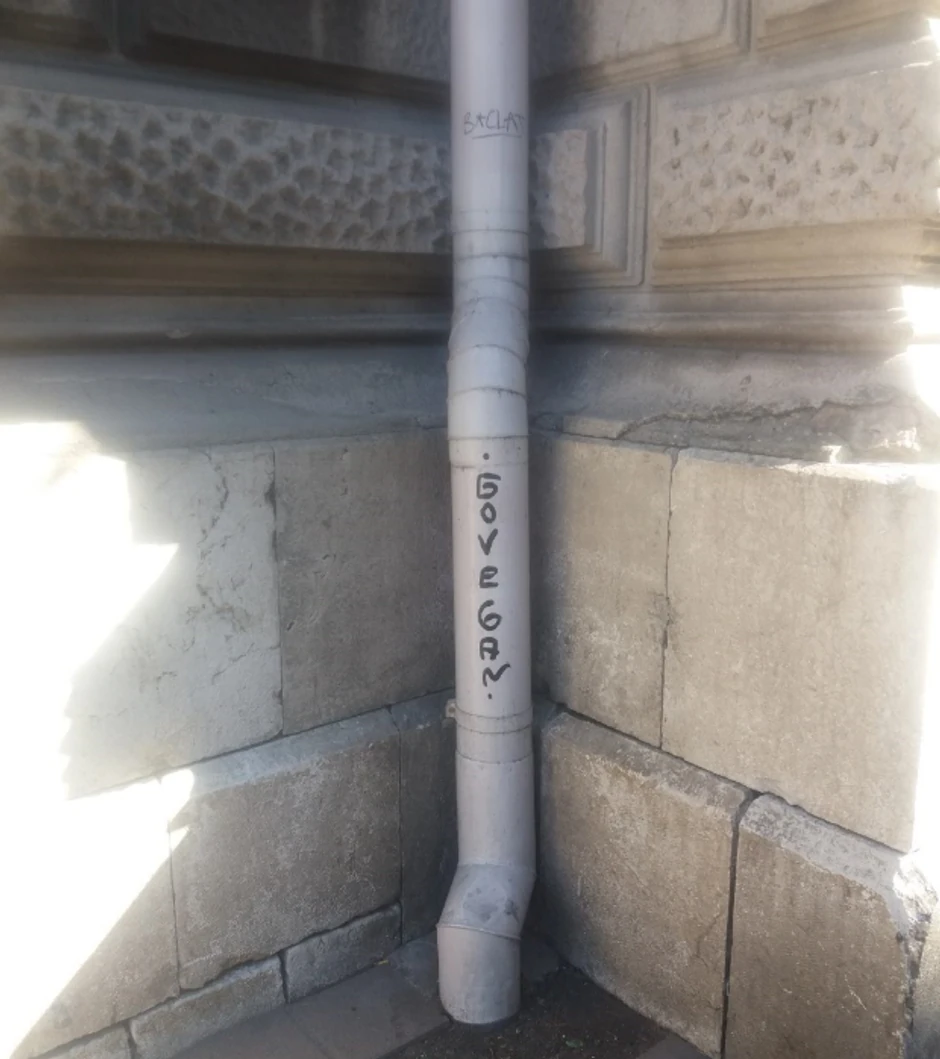 Sa druge strane zgrade, u Kralja Milana pak, "stradao" je oluk. Na njemu je na engleskom jeziku napisana poruka "Napred, vegani".