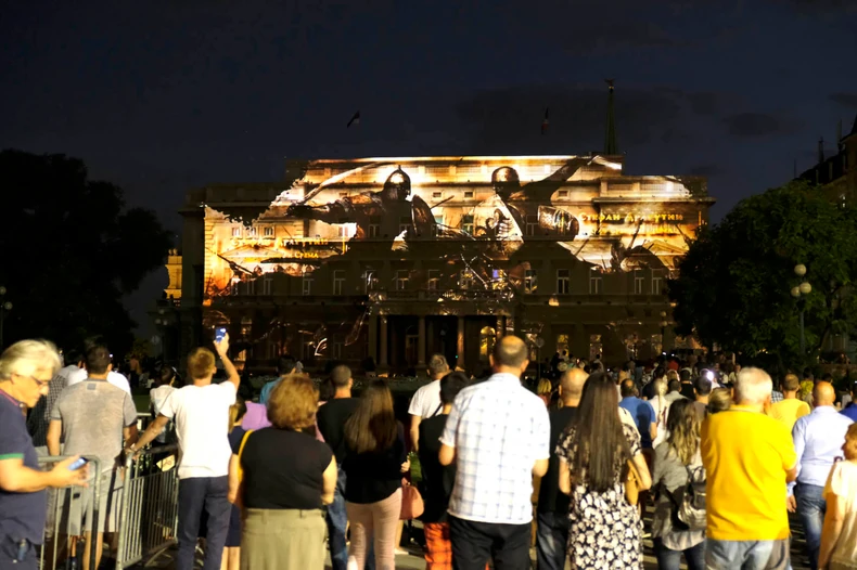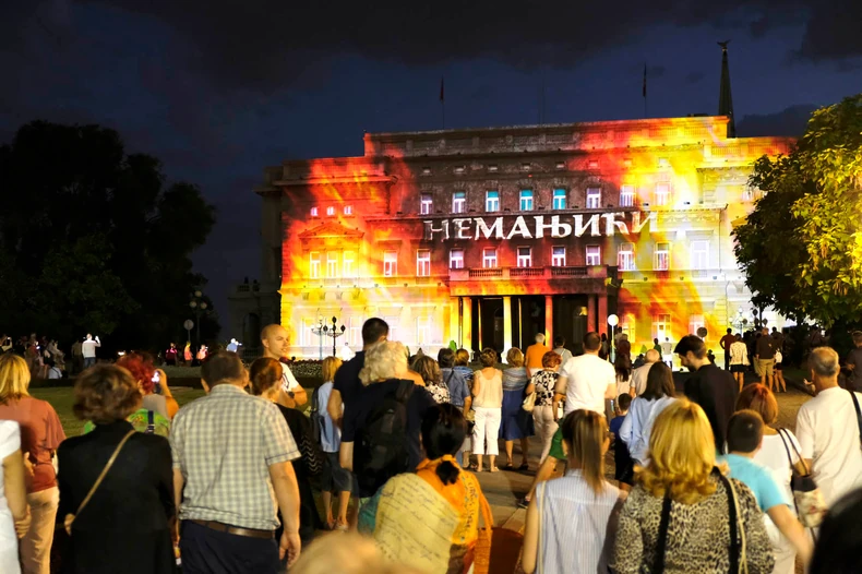Prva 4D projekcija filma "Nemanjići" na fasadi zgrade Starog dvora održana je večeras, a nekoliko stotina radoznalih sugrađana svih dobi prisustvovalo je ovom multimedijalnom spektaklu u srcu grada.