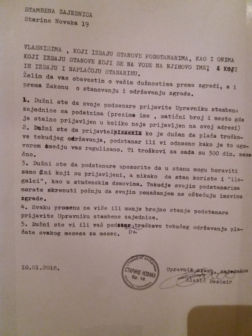 "Molim vlasnike stambenih jedinica, kao i one što stanove izdaju podstanarima, da pismeno dostave koliko ima stanara u njihovom stanu", obaveštenje je koje je osvanulo u zgradi u Ulici Starine Novaka. Na prvi pogled ništa neobično, ali pravo iznenađenje komšije je dočekalo koji red niže, kada su pročitali šta je upravnik višespratnice naveo u napomeni.