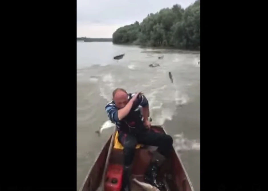 Na snimku koji je nastao u Zemunu, motorni čamac kreće se rekom, dok iza ribara koji njime upravlja skaču tolstolobici jedan za drugim, upadajući u čamac, pa čak udarajući ga po glavi, ramenima i leđima "u letu".