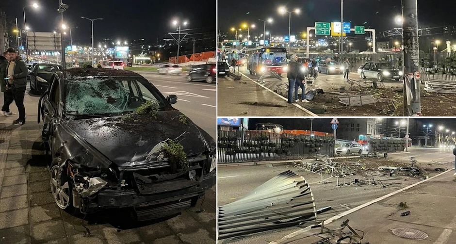 Na snimku se vidi uništena ograda i delovi koji su rasuti svuda po putu, kao i policija koja se nalazi na licu mesta.