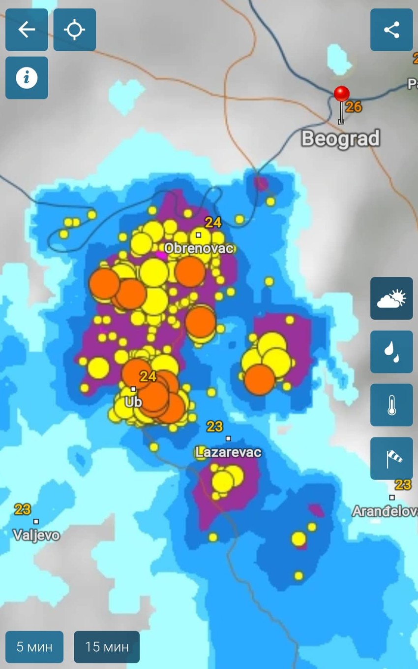- U Šumadiji, na području Beograda, Mačvi i Sremu u naredna dva sata pljuskovi sa grmljavinom. Pri intenzivnim grmljavinskim procesima lokalno se očekuje veća količina padavina - stoji na sajtu RHMZ, objavljeno u 23.30.