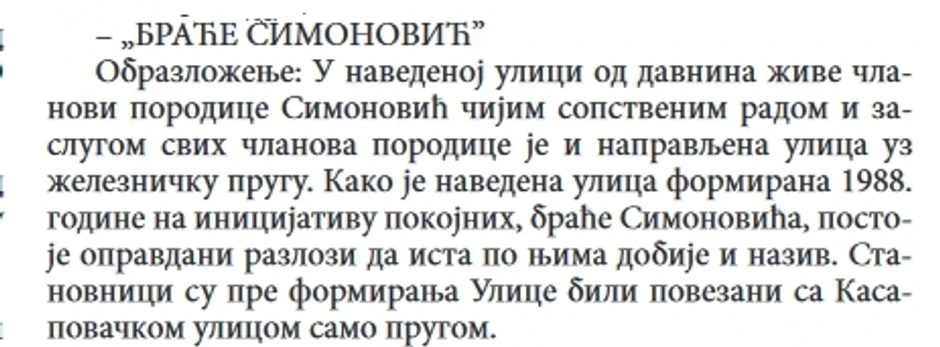 “U navedenoj ulici od davnina žive članovi porodice Simonović, čijim sopstvenim radom i zaslugom svih članova porodice je i napravljena ulica uz železničku prugu. Kako je navedena ulica formirana 1988. godine na inicijativu pokojnih, braće Simonovića, postoje opravdani razlozi da ona po njima i dobije naziv“.