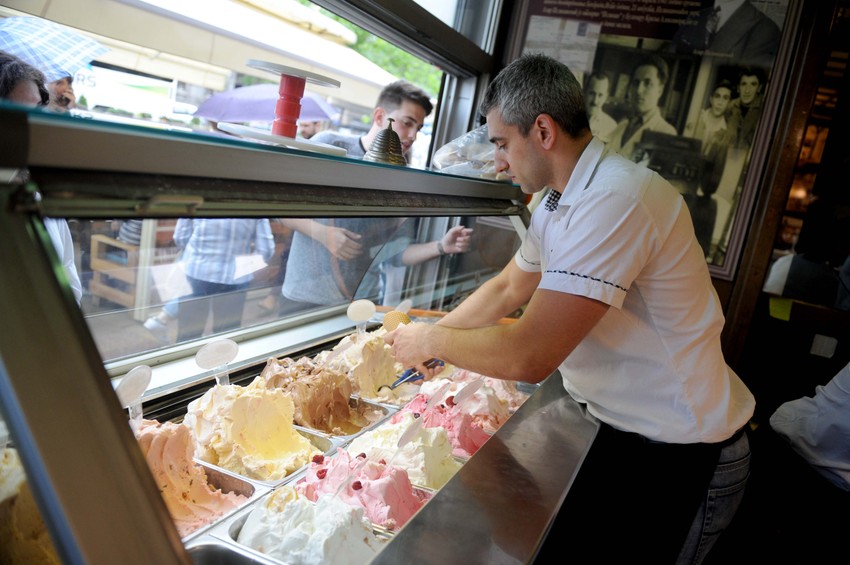 Ni kiša koja je padala, nije oterala mušterije, kišobrani i kabanice zaštitile su ih od padavina. Puna dva sata gužva se nije smanjivala, pa kako bi neko odlazio sa sladoledom u rukama i osmehom na licu, neko bi popunio "upražnjeno" mesto.