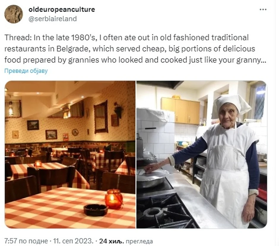 Elem, Oldeuropeanculture ovu priču na Tviteru počinje time da je “krajem 1980-ih često jeo u starinskim tradicionalnim restoranima u Beogradu, koji su služili jeftine, velike porcije ukusne hrane koju su spremale bake koje su izgledale i kuvale baš kao vaša baka”.