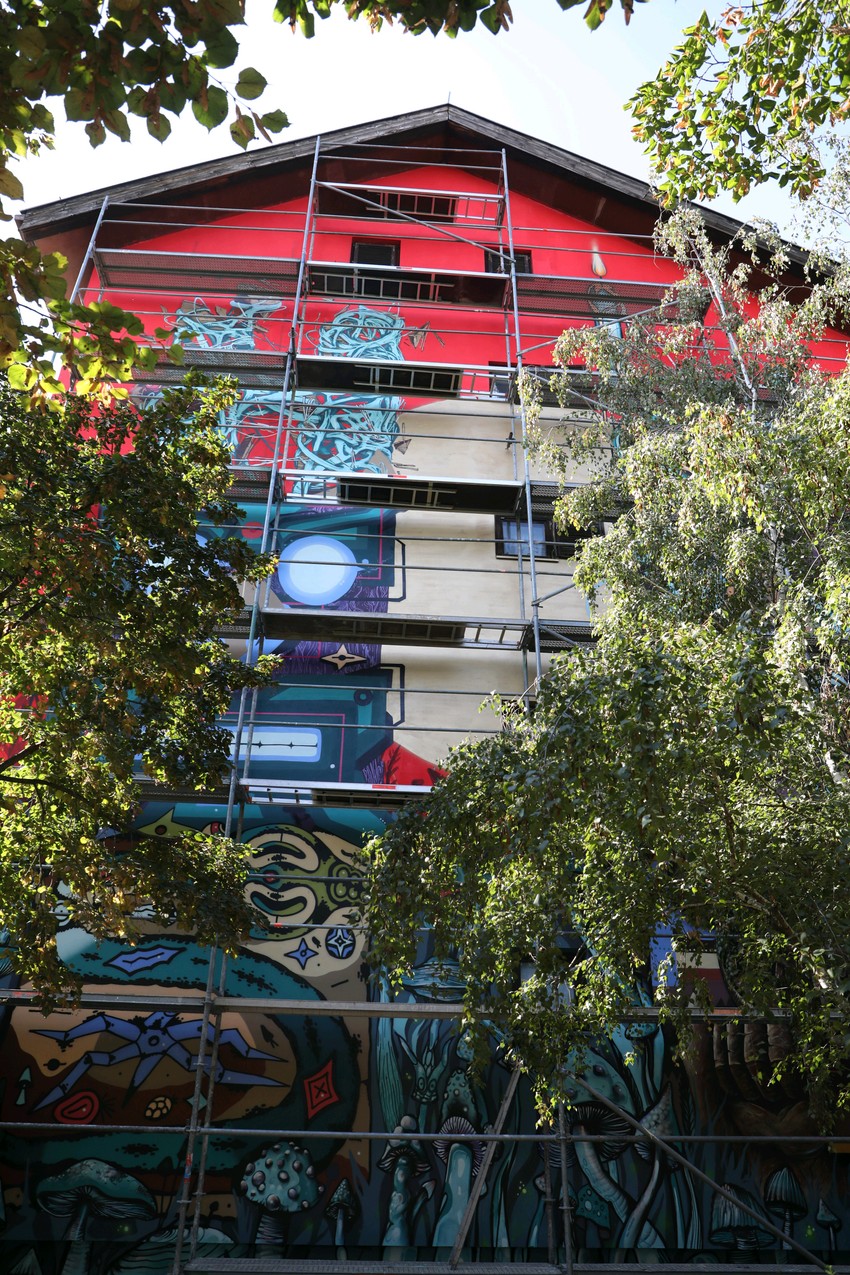 Treći je radila grupa Hesojam, njih šestorica, u Ulici Nikole Dobrovića 2, a četvrti Novosađanin Stefan - STAR koji je i dalje oslikavao, te smo ga zatekli na skeli u Ulici Dragiše Brašovana 8.
