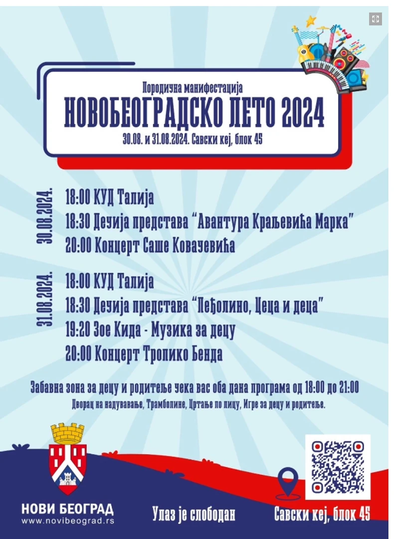 Porodična manifestacija „Novobeogradsko leto” biće održana tokom vikenda, 30. i 31. avgusta, u Bloku 45 na Savskom keju, saopšteno je iz Opštine Novi Beograd.
