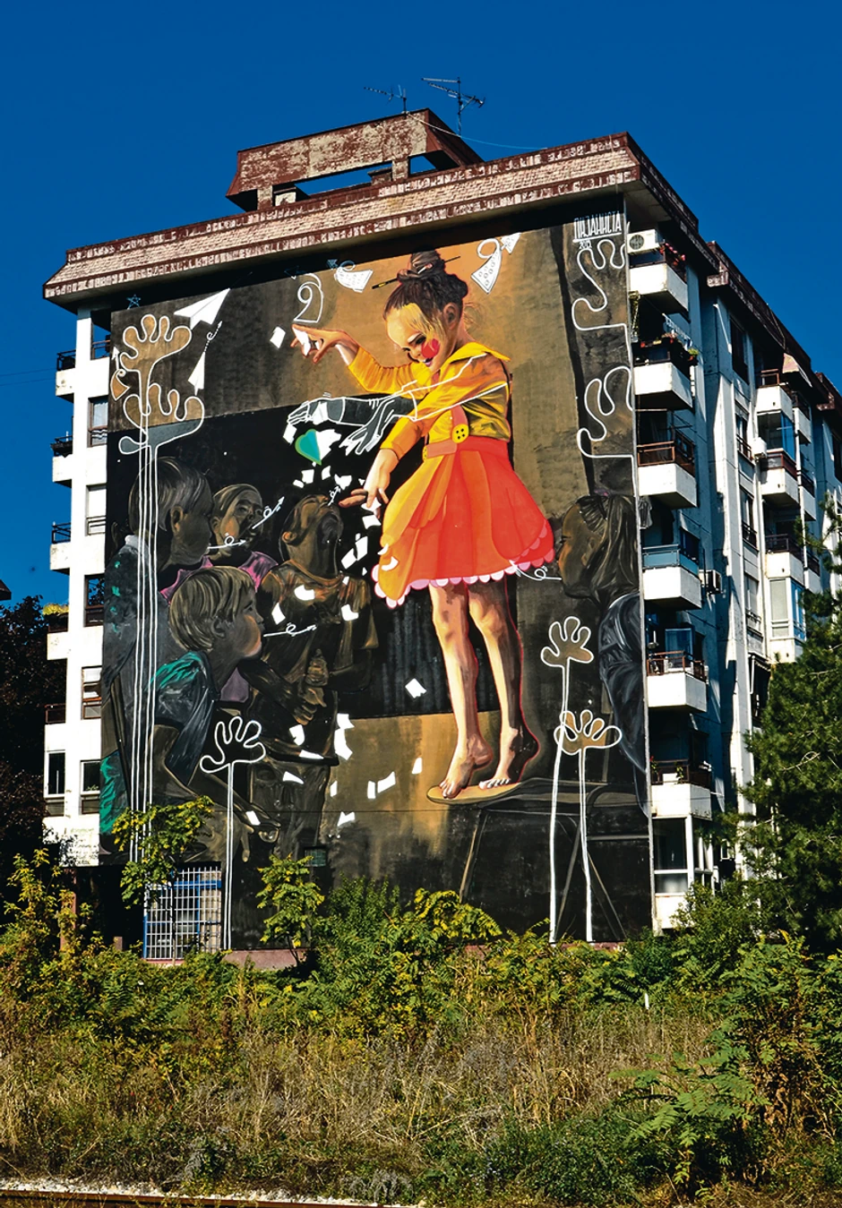 - Oslikao sam više tih jako velikih, meni jako dragih murala, koji su po prirodi stvari, za rad bili vrlo zahtevni. Ipak mogao bih da izdvojim dva. Prvi je bio Ronilac, oslikan na pilonu mosta, koji i dan danas neumorno zaranja podizanjem nivoa reke. Sa njim je počeo moj omiljeni serijal radova na vodi. Drugi je mural junakinje romana za decu i odrasle "Ja sam Akiko", devojčice koja iskače iz ustaljene obrazovne šeme i vrednovanja opšteprihvaćenog, i umesto da učiteljici pročita sastav o zimi, penje se na stolicu i cepkanjem raspršuje papiriće, dočaravajući "njen pogled na sneg".