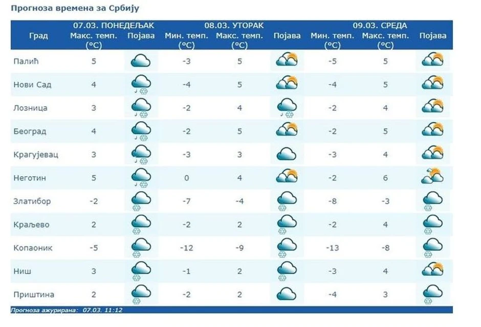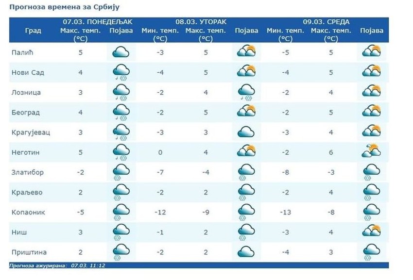 U Srbiji će ujutru biti slab, ponegde i umeren mraz, a tokom dana oblačno, mestimično sa kratkotrajnim snegom, u nižim predelima ponegde i sa slabom kišom.