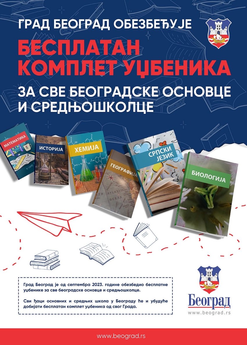 Na ulazima svih beogradskih osnovnih i srednjih škola okačena su obaveštenja od strane gradske uprave o besplatnim kompletima udžbenika koje Grad obezbeđuje, a važan je i podatak da će svi đaci osnovnih i srednjih škola u Beogradu i ubuduće dobijati besplatne udžbenike.